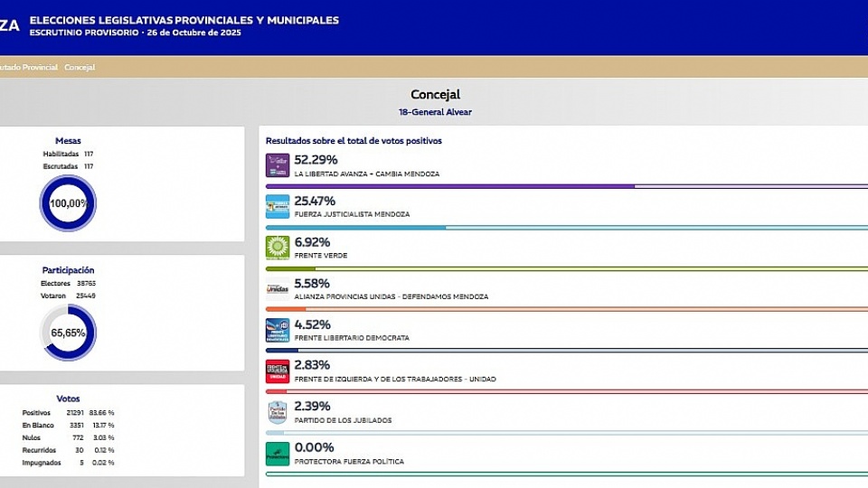 Con el total de las 117 mesas habilitadas escrutadas, el departamento de General Alvear registró una participación del 65,65%, con 25.449 votantes sobre 38.765 personas habilitadas, según los datos oficiales publicados en resultados.mendoza.gov.ar.