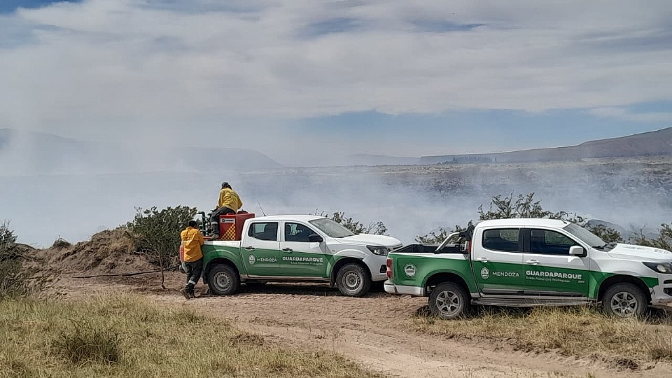 Guardaparques y Bomberos de la Policía, junto al Plan Provincial de Manejo del Fuego, continúan trabajando de forma coordinada para contener el incendio declarado en la zona de Bardas Blancas, en el departamento de Malargüe.