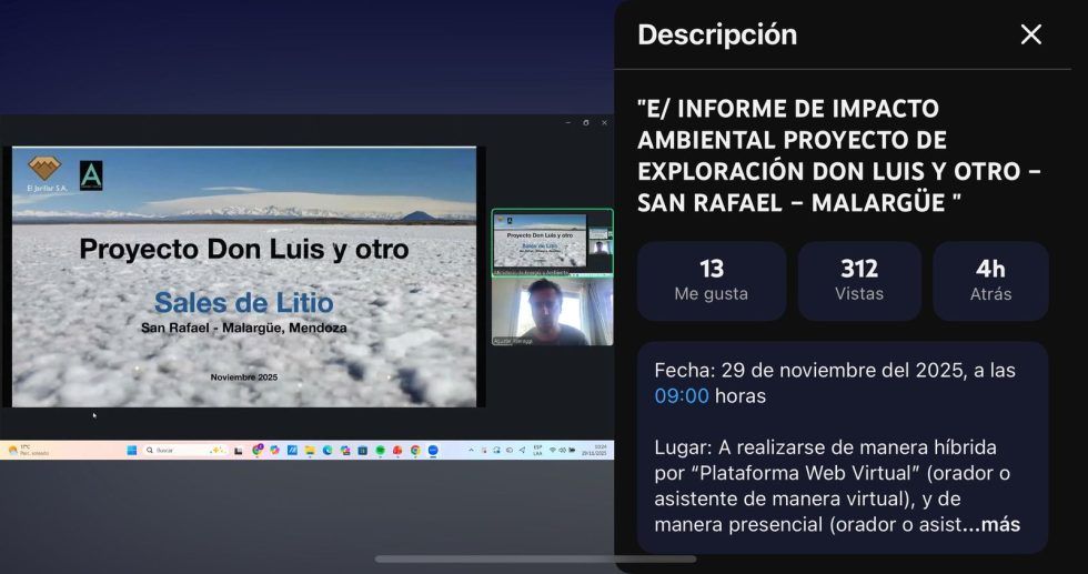 "El proyecto extendió su área de exploración de litio y desde el Gobierno de Mendoza se decidió realizar una nueva audiencia para asegurar que toda la ciudadanía esté informada. Estuvimos junto a la Autoridad Ambiental Minera exponiendo los tipos de controles ambientales que se aplican en esta actividad y detallando el procedimiento técnico y administrativo que corresponde a este proyecto", señaló Fernández.