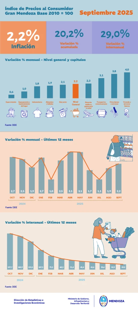 La inflación en la provincia de Mendoza fue del 2,2% en septiembre, apenas por encima del promedio nacional, que marcó 2,1%, según informó la Dirección de Estadísticas e Investigaciones Económicas (DEIE) en su informe mensual.