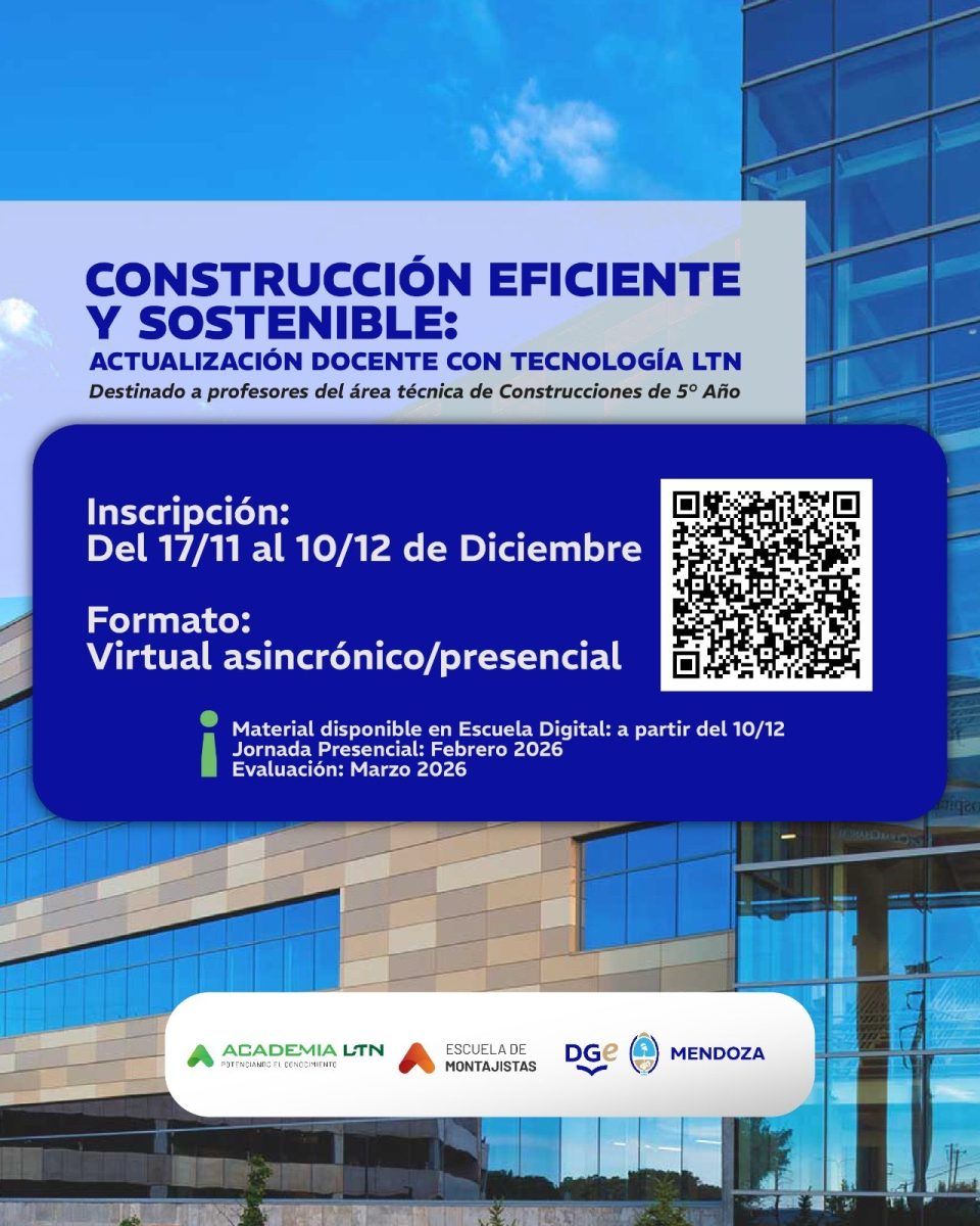 La Dirección General de Escuelas (DGE) invita a docentes de escuelas técnicas con la especialidad en construcción a inscribirse para la formación denominada Construcción eficiente y sostenible: actualización con tecnología LTN, con el fin de fortalecer la carrera docente y acompañar con calidad los trayectos escolares.