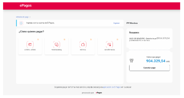 Pagar en línea o presencialmente: Si se elige el pago virtual, la página del IPV redirigirá al usuario a la plataforma de E-Pagos, donde podrá seleccionar el medio de pago de su conveniencia.