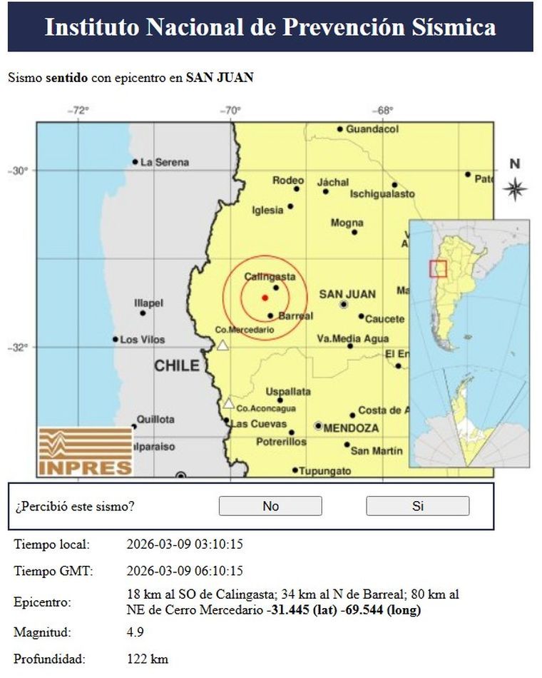 Según el Inpres, el temblor fue de 4.9 en la Escala Richter y tuvo una profundidad de 122 km.