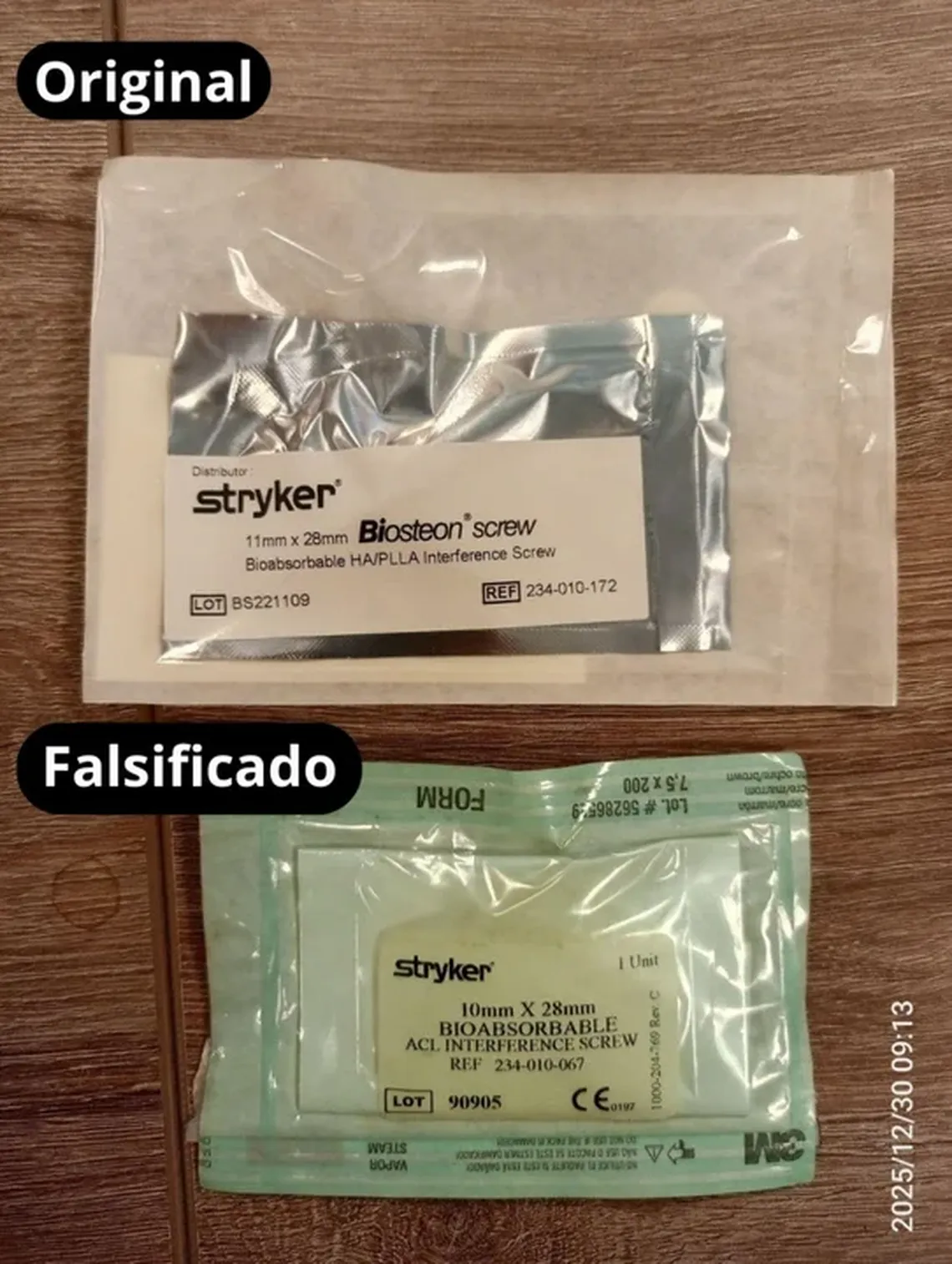 Según se informó, el tornillo corresponde a un producto que debería ser fabricado por Stryker Corporation, empresa registrada ante la ANMAT bajo el PM 594-139. Tras la inspección, la muestra recolectada fue exhibida a la responsable técnica de la compañía, quien confirmó que se trataba de una falsificación.