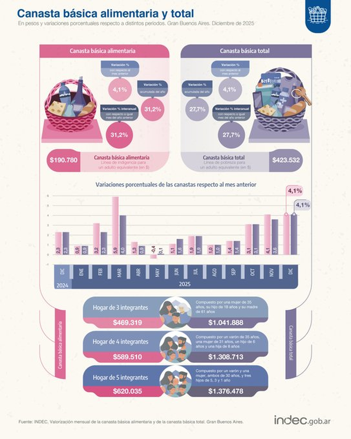 La canasta básica, sobre la cual se calcula el índice de pobreza, subió 4,1% en diciembre último, muy por encima de la inflación, que fue del 2,8%, y acumuló en el 2025 un alza del 27,75.