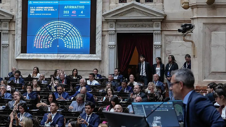 Con el peronismo dividido en el voto y la ayuda de aliados, el oficialismo consiguió en la Cámara de Diputados aprobar con media sanción el proyecto de ley que ratifica el acuerdo entre el Mercosur y la Unión Europea, el cual permitirá bajar aranceles de mas del 90% a las exportaciones y recortar las barreras de acceso para bienes industriales de Europea.