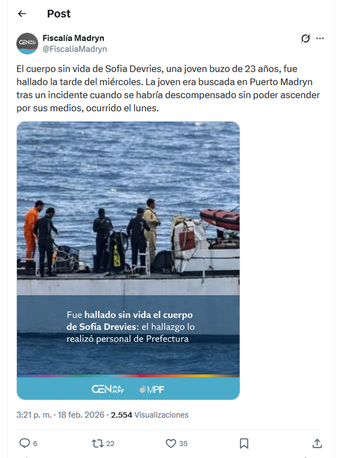 El cuerpo sin vida de Sofia Drevries, una joven buzo de 23 años, fue hallado en la tarde del miércoles en las aguas de Puerto Madryn, luego de haber sufrido el lunes una descompensación, por lo cual no pudo ascender por sus propios medios a la superficie, indicaron las autoridades la Fiscalía de esa ciudad, a través de la red social X.