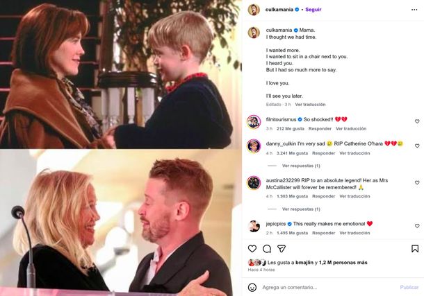 La actriz interpretó a la madre de Kevin en "Mi pobre angelito" y mantuvo una amistad con Culkin a través de los años y los vaivenes en Hollywood.